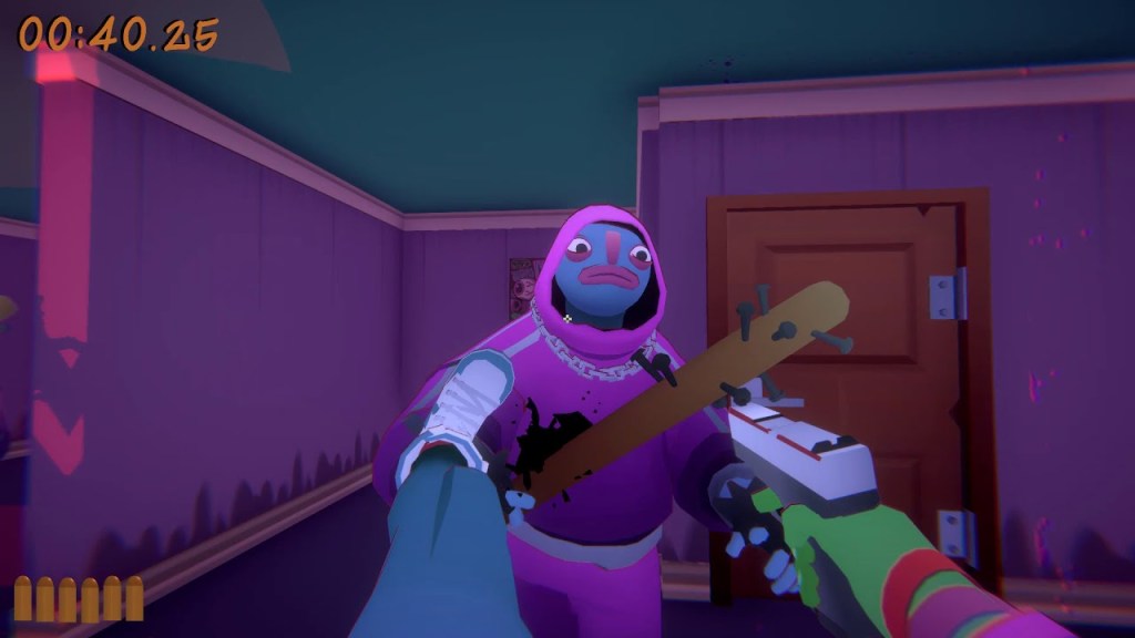 The difficulty tends to ramp up quickly with each stage, which may seem like obvious, but this is also where the strategy tends to show up as well. I found myself having to conserve the ammo I had on hand while instead throwing the gun to achieve kills. It’s effective in that for some of the zones, there may be two doors and more foes on one end defending while the other might have one bat-wielding enemy.