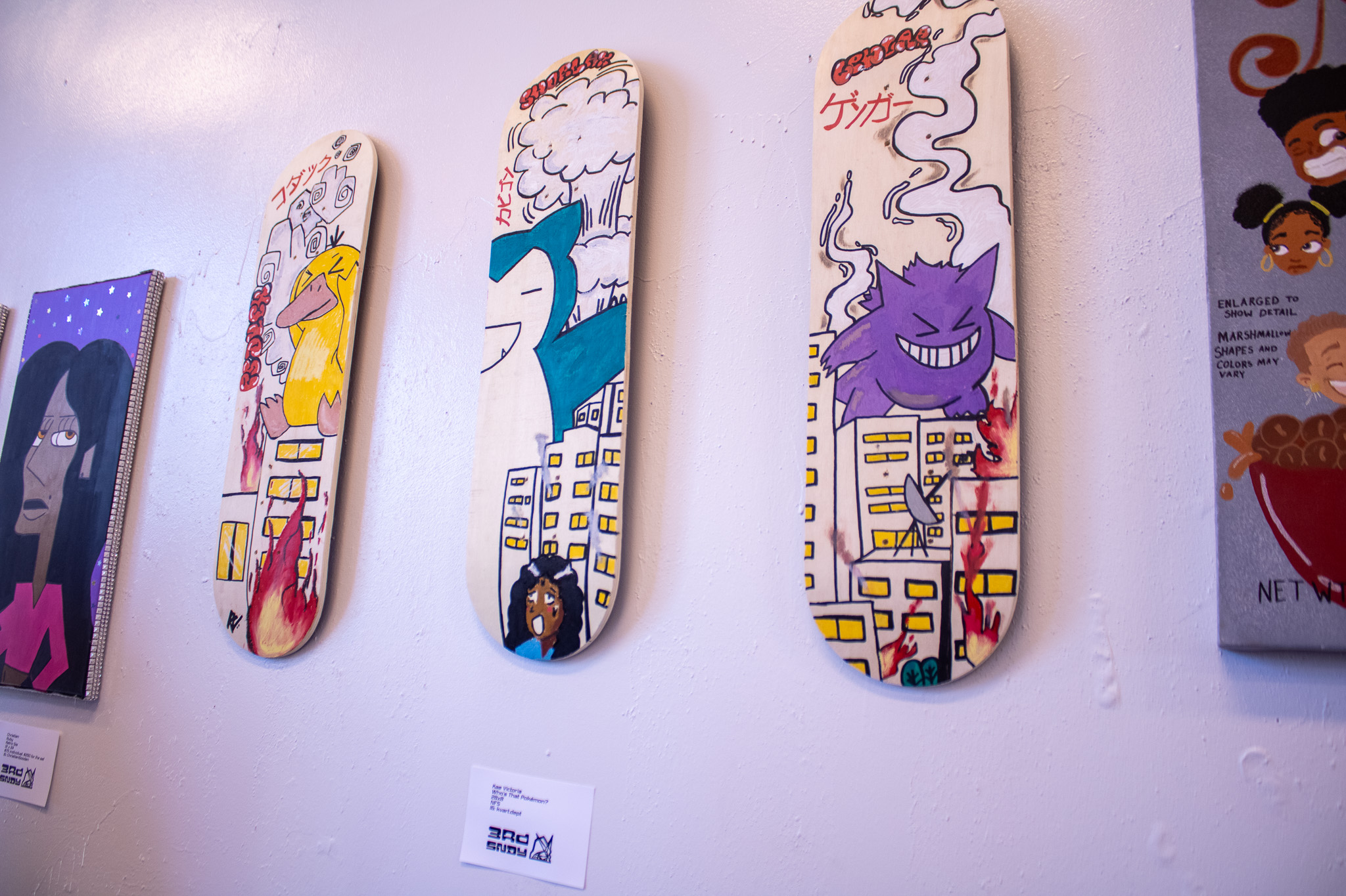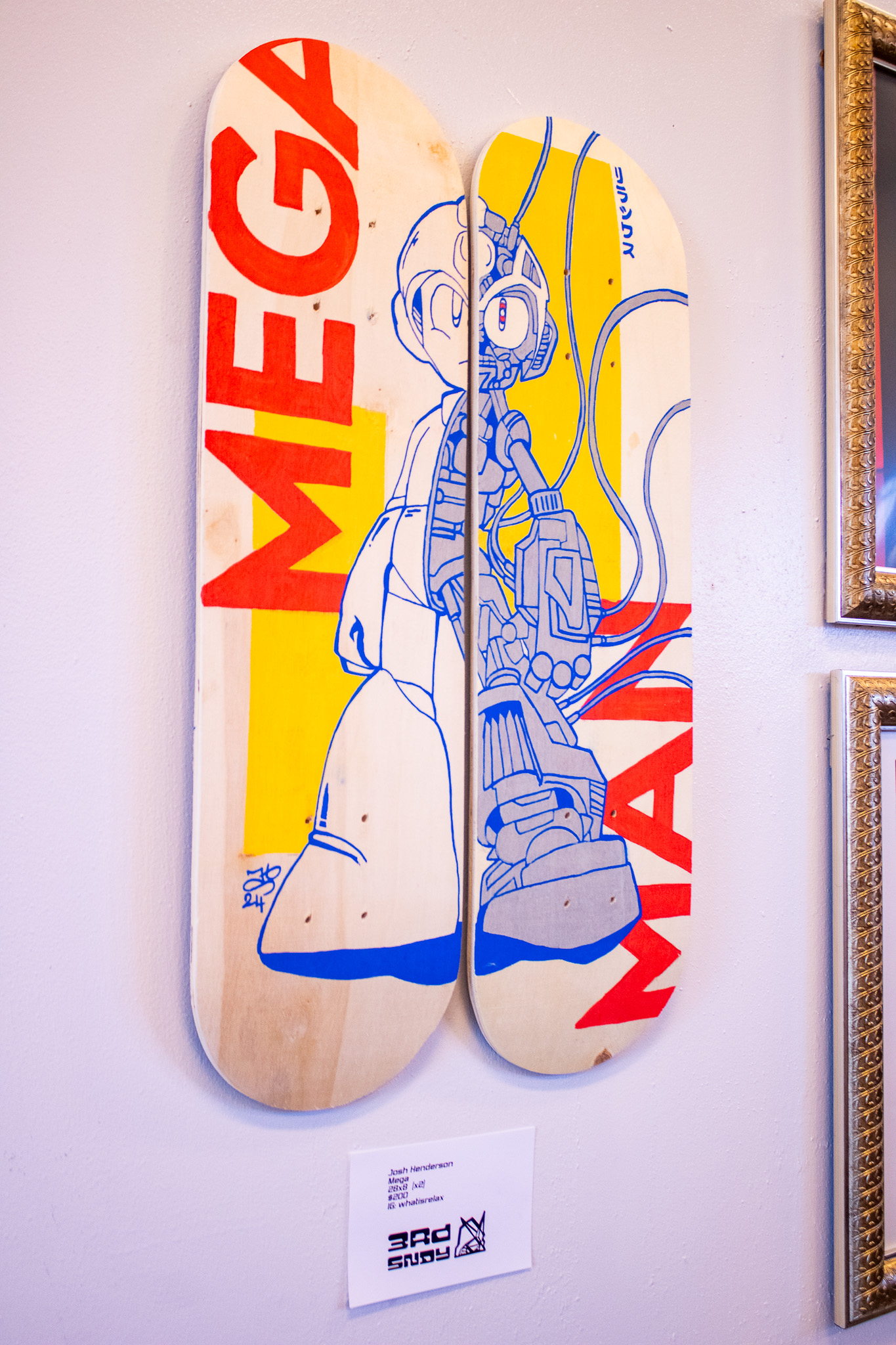 The art along the wall tells similar stories, like with Jano Ryusaru’s Toe Jam & Earl imagined in flashier era of hip-hop garbs from the late 90’s, or Josh Henderson’s Megaman mural, split between two skateboards, putting the fighting robot’s internal mechanisms on display, both artists touching on popular video game icons. In comparison, Erica Cunningham and Marcus Burke chose to direct their piece’s inspiration from the ‘toon-ier side of things, invoking familiar faces from Invader Zim and the Adventure Time multiverse.